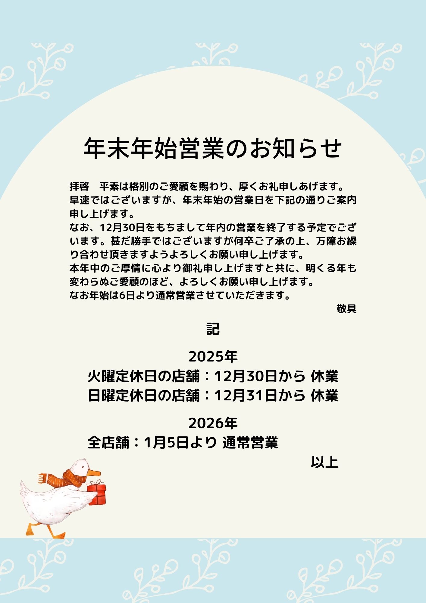 年末年始営業のお知らせ